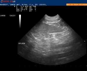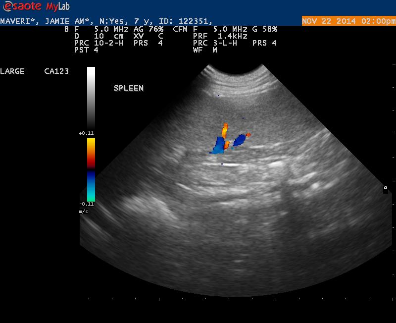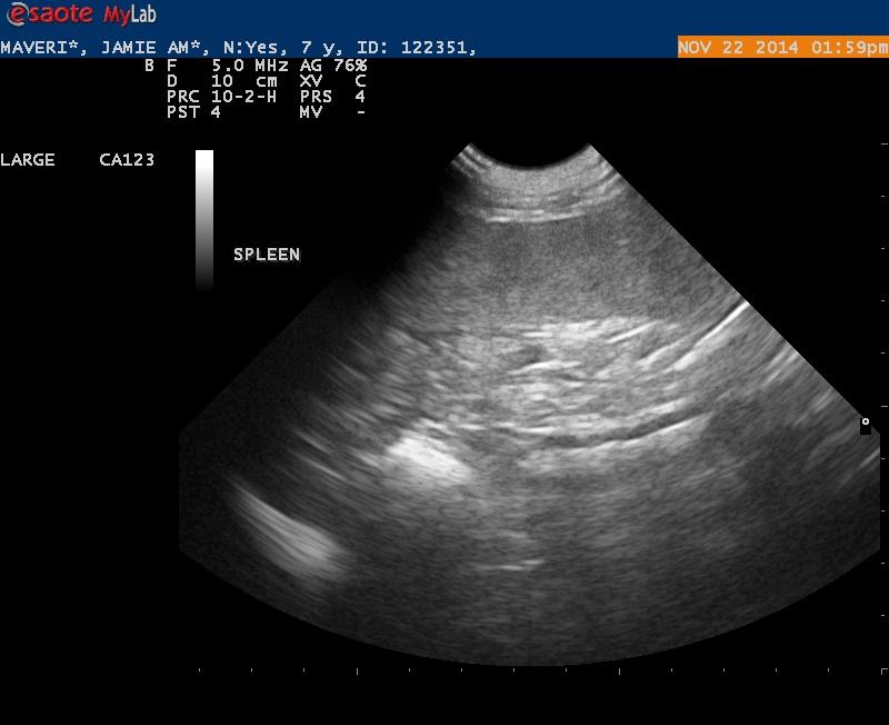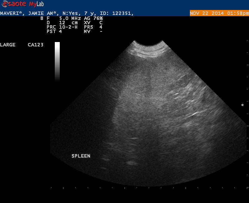 The spleen on first glance appeared to be normal- but when I went back and looked at my images I was wondering if the echotexture was a bit coarse.