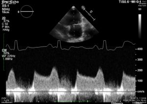 I see MS at all ages, because it is frequently missed in young dogs. But this case is not a MS. It is diagnosed as a combination of 2D-echo findings and the typical Minflow profile (E-wave very high frequently >2 m/s) confluent with A-wave. See image and video.