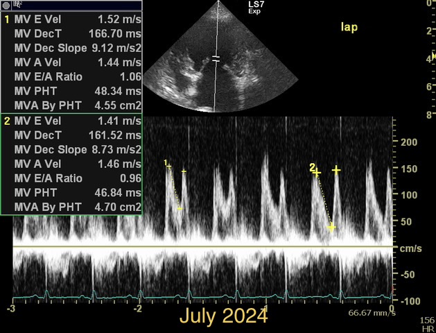 How would you diff b/w reverse remodelling and MV stenosis. Presented at recheck with mod severe pulmonary HT. Smll dog treated for chronic MVD stage C. US= LV under loading, FS > 50%, LAE remains significant. M e-vel is consistently 1.5m/s or higher but dec. time and press half time appear normal. E:A ratio around 1. Would LAE remain with aggressive medical Tx for MVD due to LA remodelling, LA compliance ,chronicity of MVD and ongoing reg. vol. compared to potential for LV to undergo reverse remodelling with Tx. Is stenosis seen much in min breed old dogs? Ls7 vid=2024. Tks!!