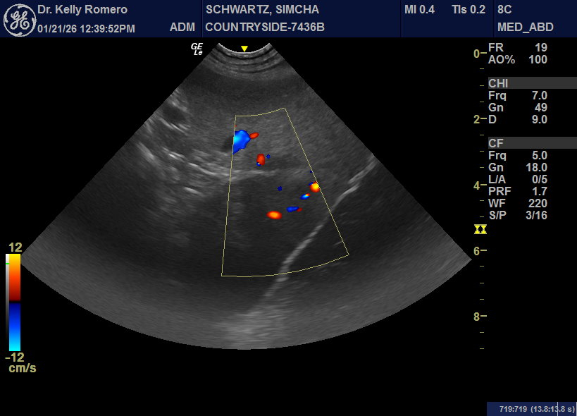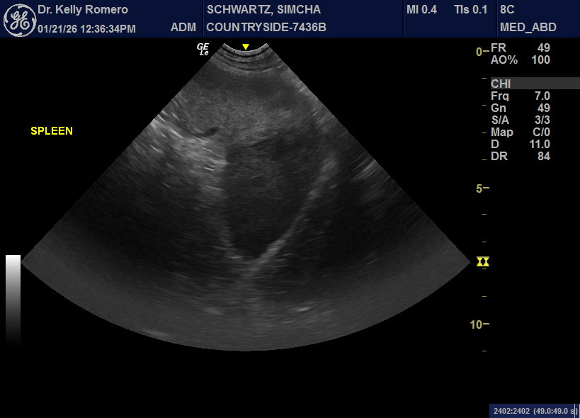 10 yr FS Shep cross with lethargy, weakness and dec. appetite. Concern for the hypoechoic splenic head. Could see vessels on doppler, but think they were attenuated to those in the body. Patient was not painful during the exam. FNAs of the spleen, irregular liver (nodular) and the hypoechoic cranial abdominal lesion shown in the last video are pending. Regarding the latter, no fluid obtained when aspirating other than for slide. Lesion ventral to the stomach and caudal to the liver, not in the region of the pancreas. How worried re spleen blood flow while aspirates pending?